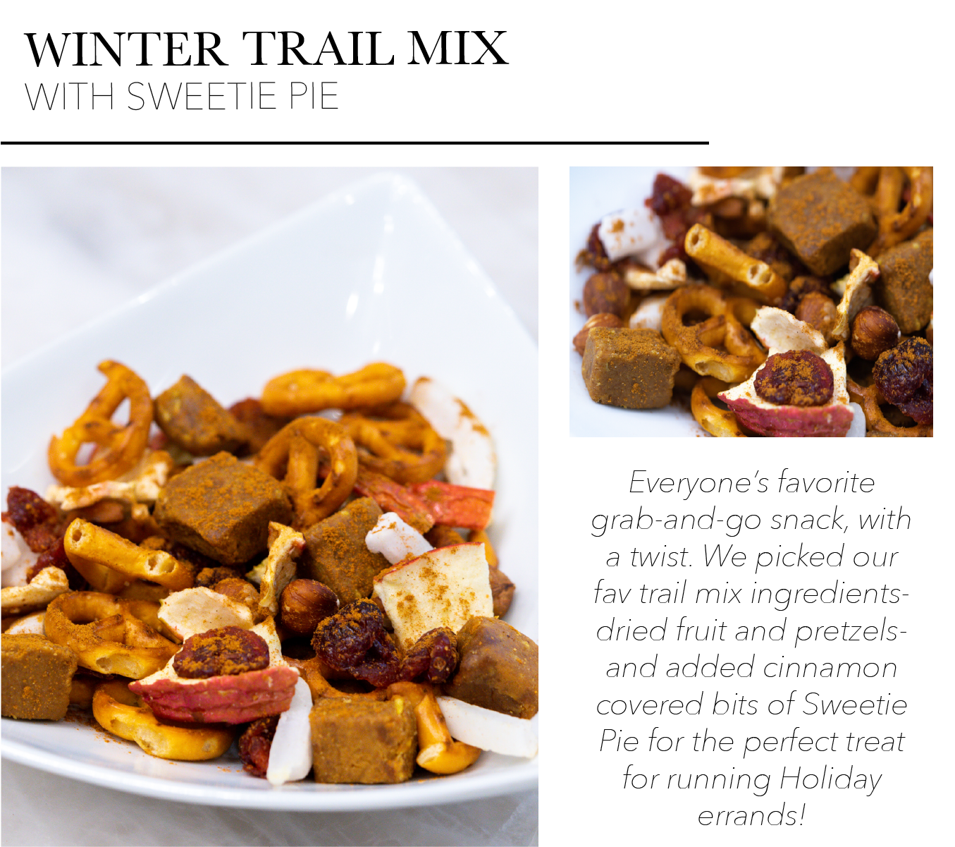 Ingredients 4 Kalumi BEAUTYfood Sweetie Pie Bars 1 medium bag of Gluten Free Pretzels 2 cups of Dried Cranberries 1 cup of Coconut flakes (sweetened or unsweetened) 2 cups of Dried apple slices 1 cup of Hazelnuts Cinnamon |