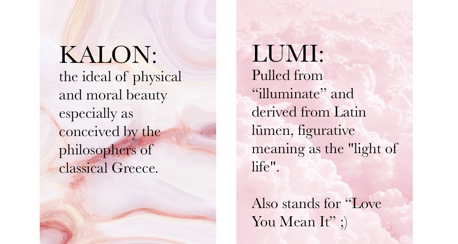 Ka.lu.mi: (KAH-LUE-ME) is an amalgamation of the Greek word “kalon” and the word “lumi”.